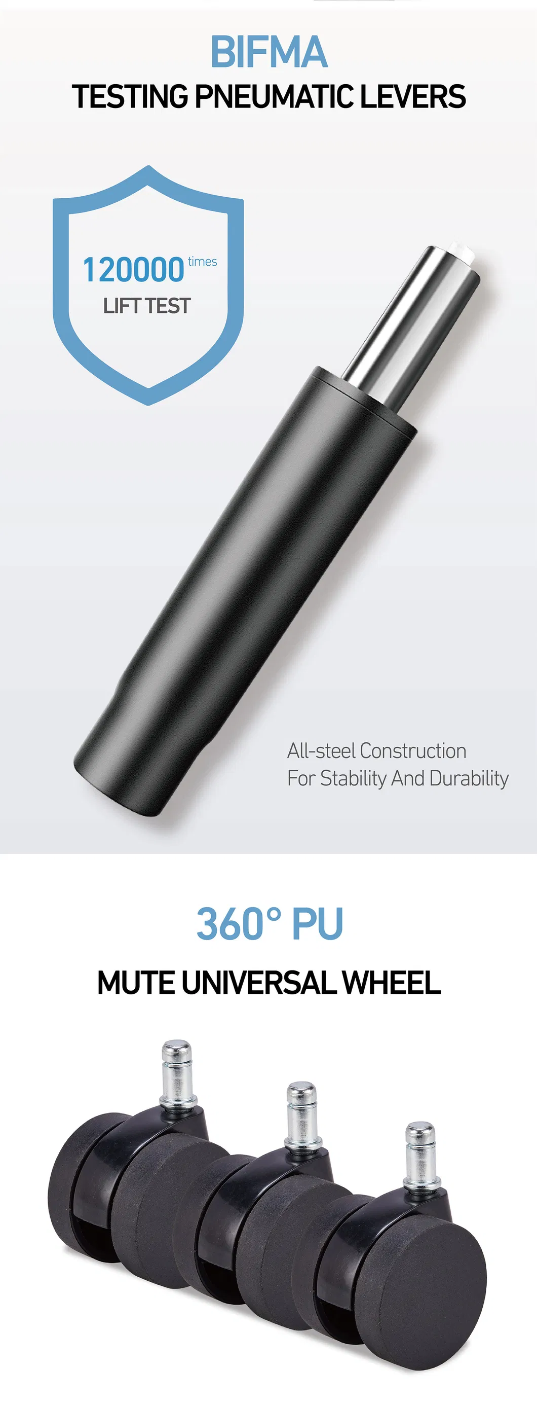 | Components | Adjustable headrest, BIFMA tested frame, Class 3 gas lift, PP base |